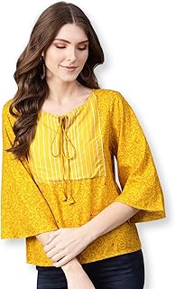 Women’s Yellow Rayon Printed Top | 3/4 Sleeve Blouse with Crew Neck, Contrast Yoke & Neck Tie-Up | Stylish Casual Ethnic