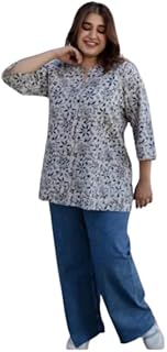 Women's Plus Size Floral Print tuton Top, Three Quarter Sleeves, Casual Wear, Grey and White Pattern (in, Alpha, S, Regu