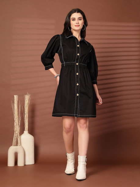 Women Shirt Black Above Knee/Mid Thigh Length Dress