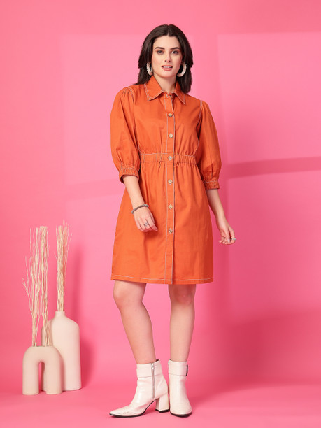Women Shirt Orange Above Knee/Mid Thigh Length Dress